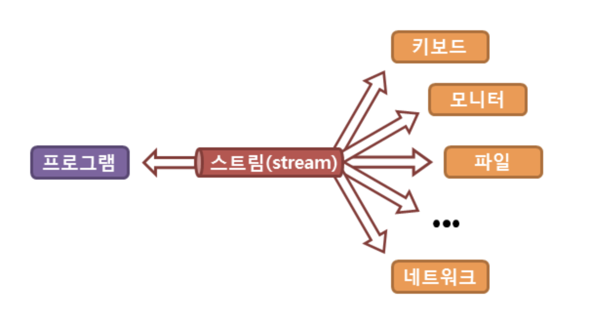 자바에서는 파일이나 콘솔의 입출력을 직접 다루지 않고, 스트림(stream)이라는 흐름을 통해 다룬다.